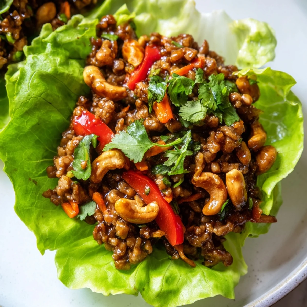 These vibrant lettuce cups combine lean ground beef with aromatic garlic, ginger, and a blend of soy, hoisin, and oyster sauces. The mixture gets extra crunch from diced vegetables and toasted cashews, all nestled in crisp butter lettuce leaves.