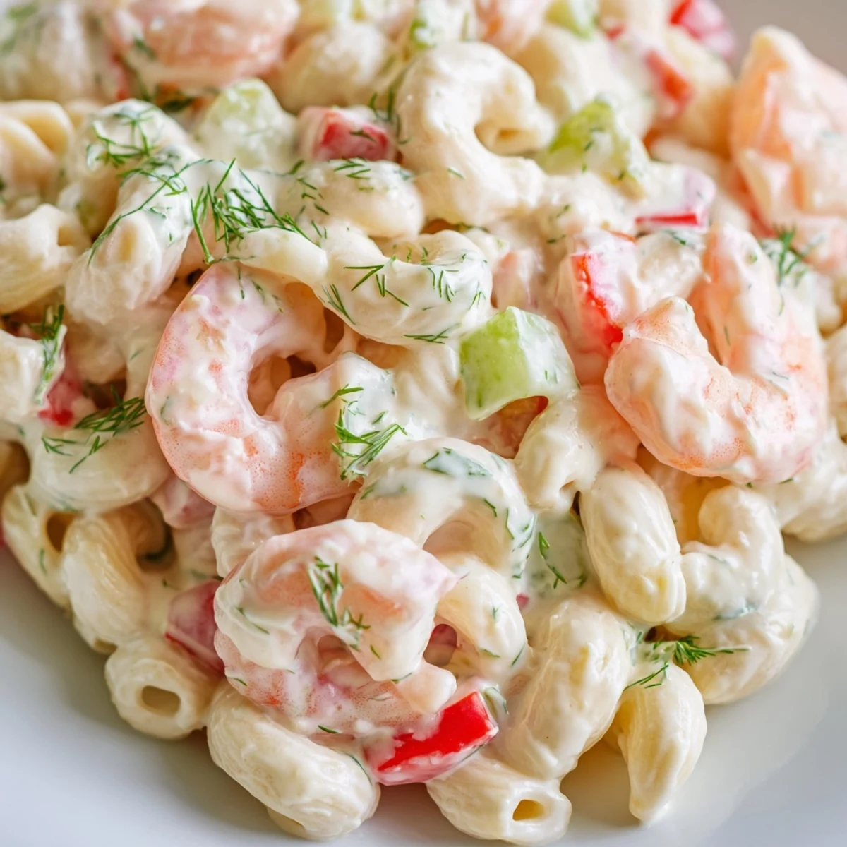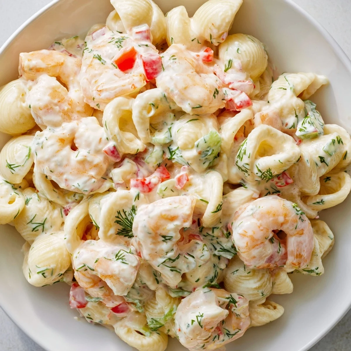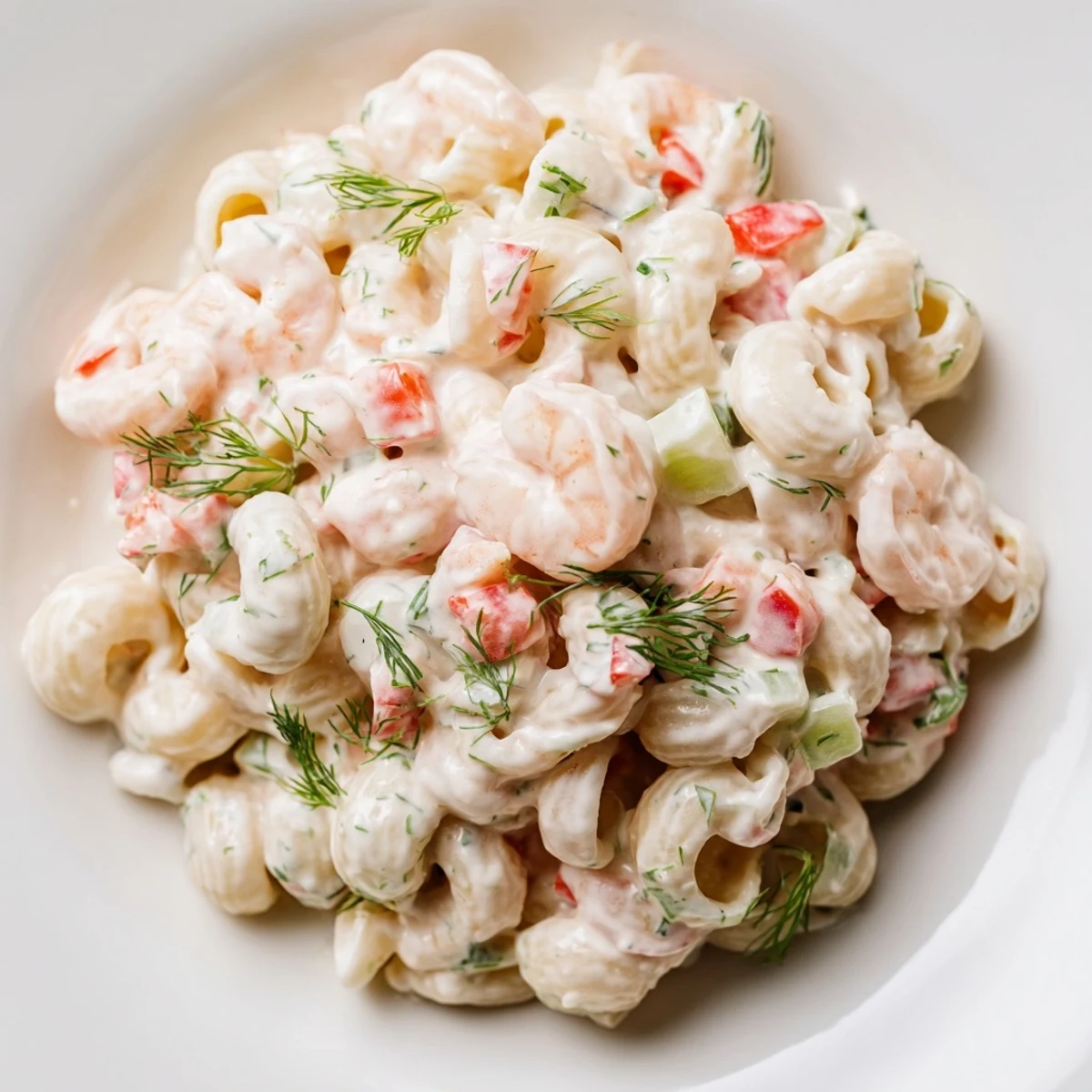 - Small pasta shells or elbow macaroni: The curves catch the dressing and tiny shrimp pieces in every bite