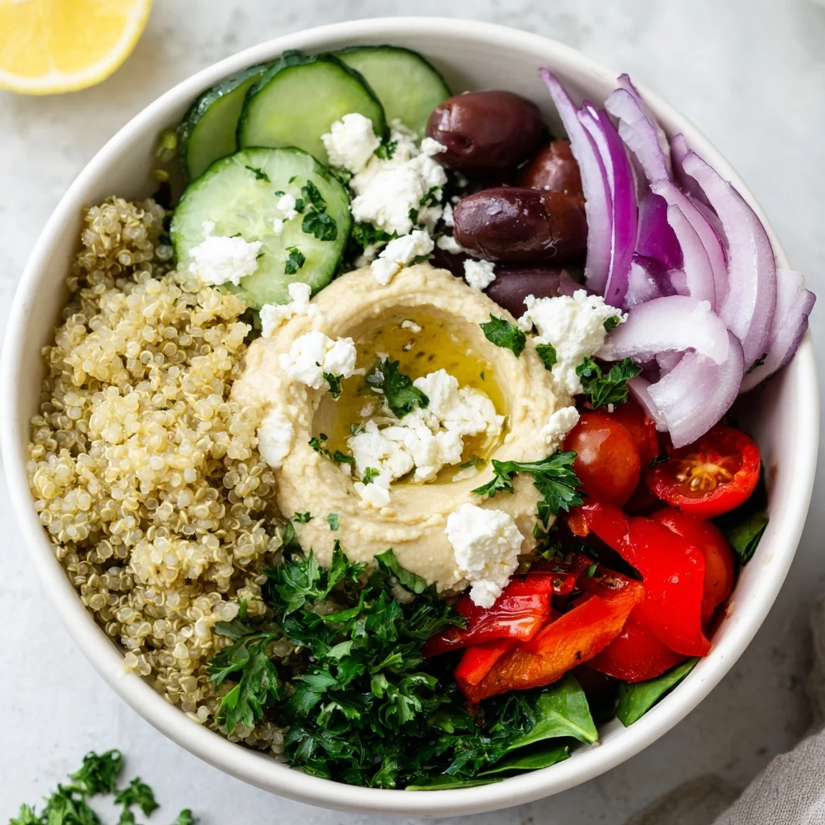 This Mediterranean-inspired bowl combines fluffy quinoa with crisp vegetables like cherry tomatoes, cucumber, and roasted red peppers. Tangy feta cheese and Kalamata olives add authentic Mediterranean flavors, while creamy hummus brings richness and protein. The simple olive oil and lemon dressing brightens all the ingredients. Ready in just 35 minutes, this nourishing bowl serves four and works perfectly for meal prep. Vegetarian and naturally gluten-free, it's easily customizable with grilled chicken or falafel for extra protein.