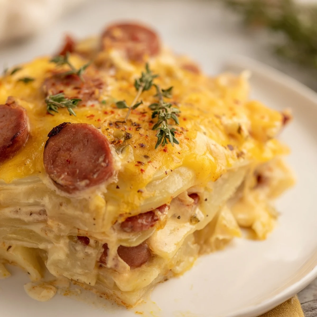 Layers of russet potatoes and sliced kielbasa simmer slowly in a rich, homemade cheddar sauce until fork-tender. The creamy half-and-half base, thickened with cornstarch and infused with garlic, onion, and thyme, creates velvety comfort food that practically cooks itself. After 4-5 hours on low, the potatoes absorb all the smoky, savory flavors while melting into the cheese. The final sprinkle of cheddar on top forms a golden, bubbly crust. Perfect for busy days when you want something hearty and satisfying waiting for you at dinner time.