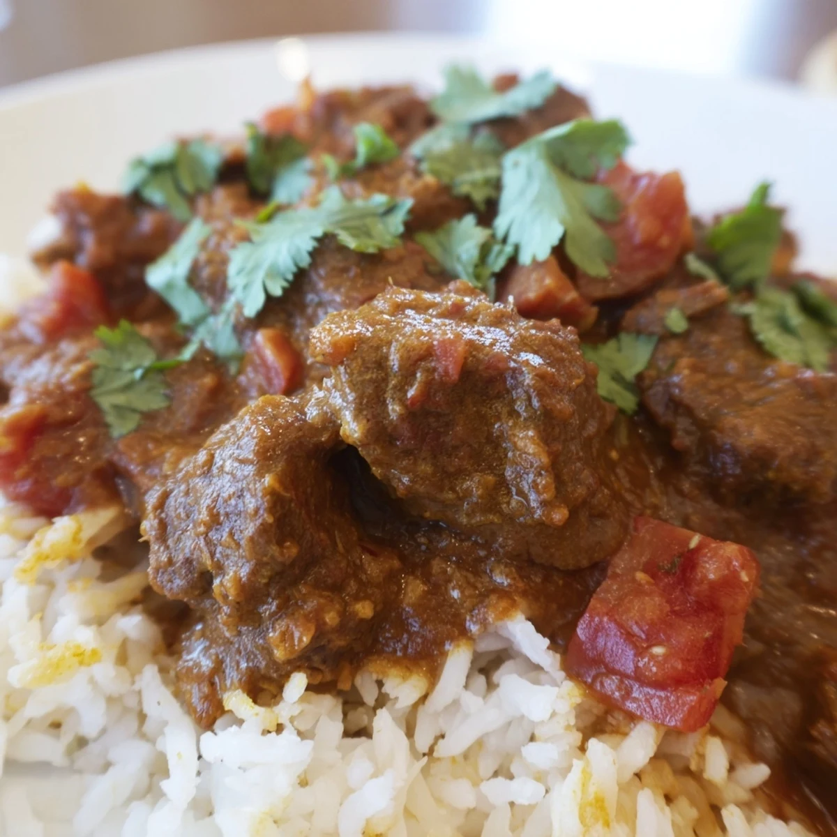 This dish features succulent beef cubes slowly simmered in a fragrant blend of spices including cumin, coriander, turmeric, and chili powder, creating a robust sauce enriched with coconut milk. The curry is served atop perfectly cooked, fluffy basmati rice, providing a balanced texture and subtle aroma. Fresh cilantro adds a bright finish, while optional fresh chilies spice up the flavor profile. Ideal for those who enjoy medium heat and complex spice combinations.
