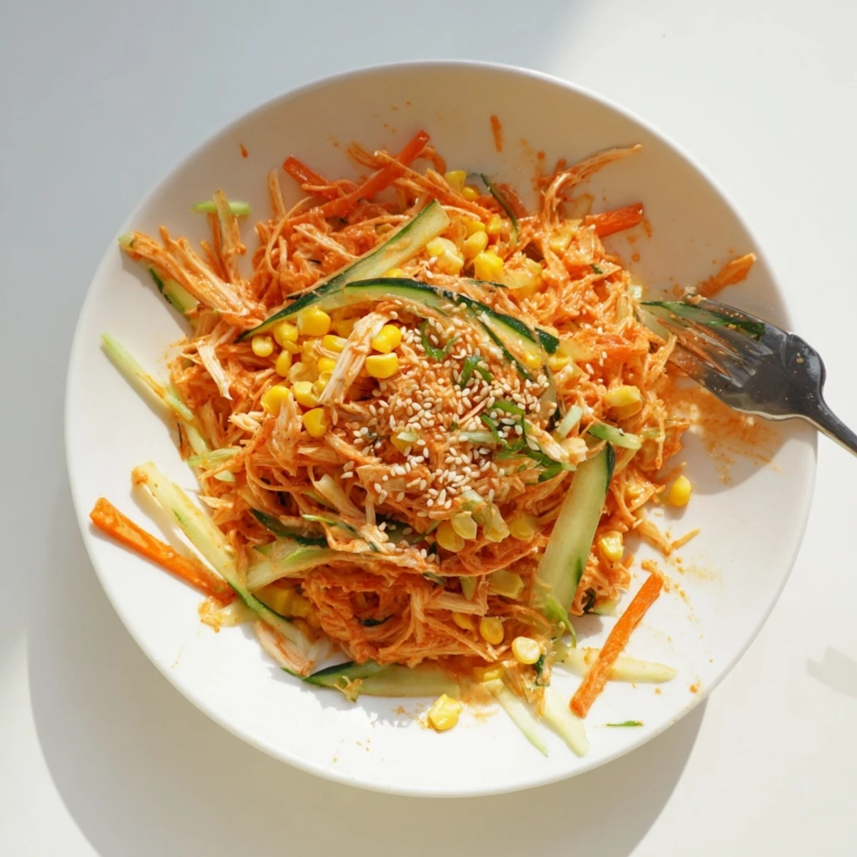 This vibrant Japanese-inspired dish combines shredded imitation crab with julienned cucumber and carrot, all tossed in a rich, spicy mayonnaise-based dressing. The preparation comes together in just 15 minutes, requiring no cooking—simple vegetable prep and whisking together the flavorful sauce. The creamy dressing balances heat from Sriracha with tangy rice vinegar and savory soy sauce, while toasted sesame seeds add nutty crunch. Ideal for warm weather entertaining or as a light lunch, it pairs beautifully with chilled sake or green tea.
